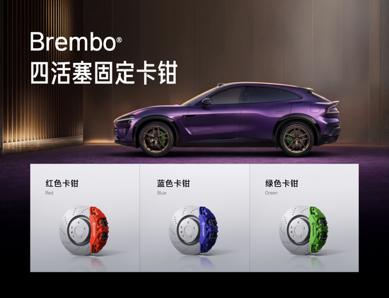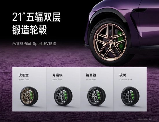 我们还新增了 21 英寸的五辐双层锻造轮毂,这个轮毂用 20 多把刀头铣削,铣削加工耗费将近 11 个小时,非常精致,一共有 4 种颜色可选,分别为琥珀金、月岩银、镜面银、碳黑。卡钳也有 3 款颜色可选,分别是红色、蓝色、绿色。车标新增了两款 24K 金白陶瓷车标与 24K 金黑陶瓷车标,一共有 4 款可选。