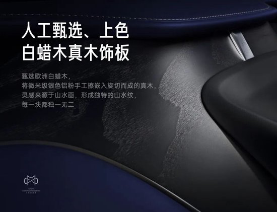 小米定制服务还将带来两款定制的内饰。首先是龙胆蓝,黑蓝双色。最特别的是蓝色的 Alcantara®, 包裹着座椅,像天鹅绒的质感。真木饰板,是甄选的欧洲白蜡木,每一片都有独一无二的山水纹。