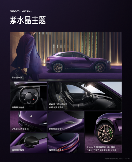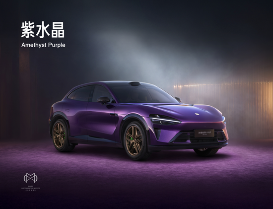 小米YU7 除了首发的 9 款颜色外,我们额外新增了 5 款颜色,每一款都非常惊艳,采用了各种先进工艺和昂贵色漆。首先是紫水晶,深邃浓郁非常贵气,设计灵感来源于乌拉圭紫水晶。