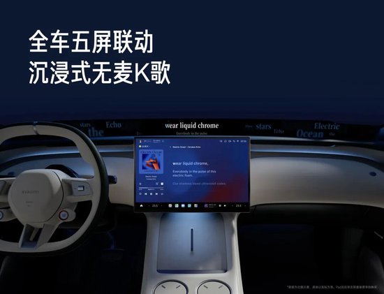 比如沉浸式无麦 K 歌:在驻车时候可以和朋友一起唱歌,小米天际屏还可以全屏歌词,5 屏联动,氛围感拉满。