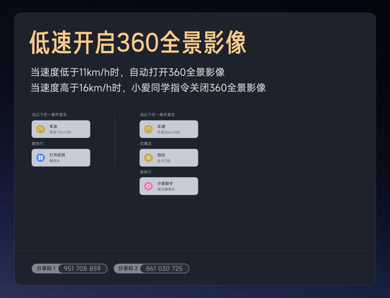 还有小米超级任务,能够用 1 条命令完成多个动作的操作,比如低速自动开启 360 影像,当时速低于 11 公里,自动打开 360 影像,方便你过窄路、会车、拥挤路段、地库等。