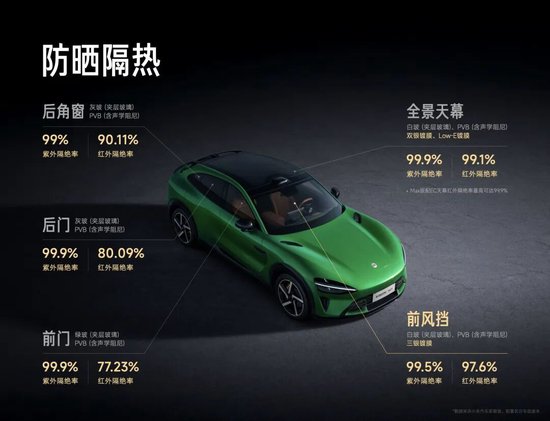 第三是更出色的整车防晒,车顶天幕玻璃做了 2 层镀银、前风挡 3 层镀银、四门玻璃都有防晒、隔热处理,甚至包括后角窗。小米YU7 Max 还标配智能调光天幕,真的不需要贴膜。