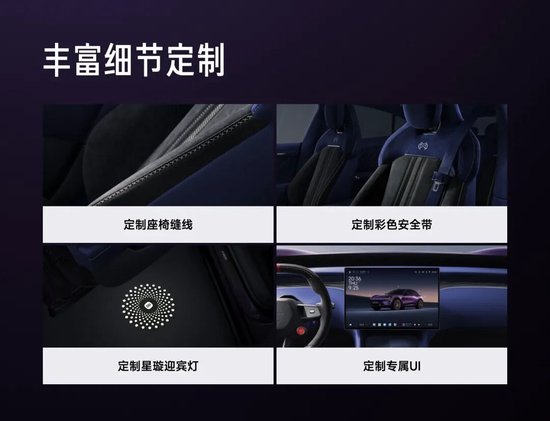 还有各种定制细节,比如定制缝线、定制的迎宾灯、定制彩色安全带等。以及工艺细节,比如刺绣 Logo、门板的专属铭牌等。