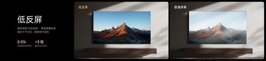 这一次还全新升级了“广视角低反屏”,低反涂层反射率低至 0.5%,整机抗反光能力比普通电视提升了 3 倍,做到了“强光下不泛白,暗场戏不发灰”,同时更佳观看视角也提升了 30%,能实现正看、侧看,色彩还原都非常好。