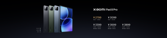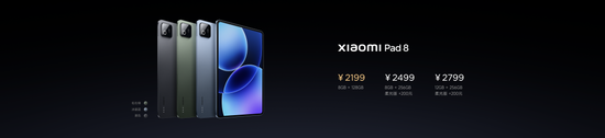 小米平板 8 提供 3 款内存配置,分别是:8GB+128GB,2199 元,8GB+256GB,2499 元,12GB+256GB,2799 元。8+256GB 及以上版本可选配柔光版。