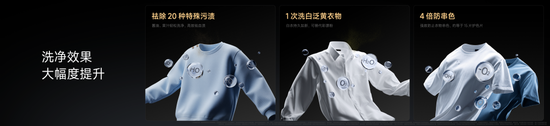 这项技术使洗净能力大幅提升,可以祛除超过 20 种特殊污渍,针对日常汗渍发黄的衣物可以 1 次洗白。同时,深浅衣物混洗也不用担心,防串色的效果相当于 15 片护色片,对比之前提升了 4 倍。