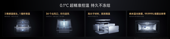 它内置了 3 颗高精度的感温探头,能做到 1 毫秒感温,温度一旦波动能快速调整。还有 34 个出风口,像鱼骨一样,均匀覆盖整个专区,让冷气充盈,减少温度波动。同时外层还包裹了高分子材料,让专区高效隔温,不 *** 扰。加上纳米蓝光除菌灯,能更好地除菌,同时延长保鲜时间。
