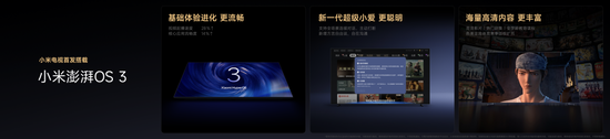 系统体验上,首发搭载小米澎湃OS 3,操作更加丝滑流畅,支持新一代超级小爱,能实现真人式连续对话,还有海量的高清内容,提供丰富的观看选择。