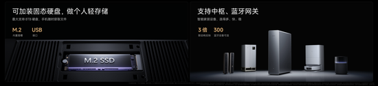 它还是全屋设备、数据的控制中心。首先备受好评的存储扩展功能回归,可以外接固态硬盘,不仅支持 USB,还升级了 M.2 插槽,更大可支持 8TB,用来做个人存储,存照片、存视频、出门在外获取家中的重要文件,都非常方便。同时,还内置智能中枢网关、蓝牙 Mesh 网关,能让全屋智能家居联动响应快 3 倍,还能连接 300 台小米蓝牙设备,让智能家居的控制又快又稳。