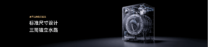 尺寸依旧是标准尺寸,家里的柜体不用改装,可以直接更新换代。三个筒是独立水路设计,避免交叉感染。得益于整机的悬挂系统,三筒一起洗衣,也特别稳不会晃。