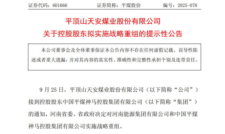 9月25日晚,(601666)、(600810)、(300080)、(838402)和(600403)5家A股公司公告显示,河南省委、省 *** 决定对河南能源集团有限公司和中国平煤神马控股集团有限公司实施战略重组。