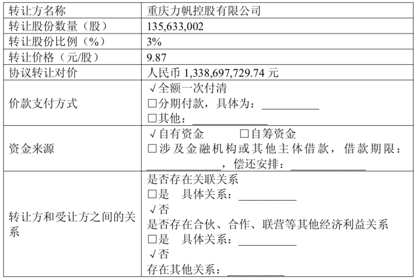 此外,公告还显示,力帆控股、梅赛德斯-奔驰(上海)数字技术有限公司(下称“奔驰数字技术”)分别与华创股份和申万宏源签署《股份购买协议》,力帆控股将其持有的合计1.36亿股公司股份(占公司总股本的3.00%),以9.87元/股的价格,通过协议 *** 方式 *** 给奔驰数字技术,协议 *** 对价为13.39亿元,以偿还相关债务。同时,奔驰数字技术承诺,自股份过户登记至其名下之日起12个月内不减持。