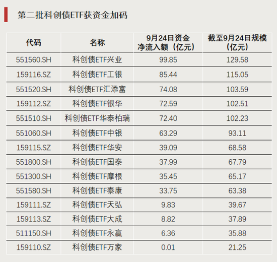 9月24日,第二批14只科创债ETF上市交易,当日合计净流入额达638.94亿元,5只科创债ETF规模均突破百亿元。