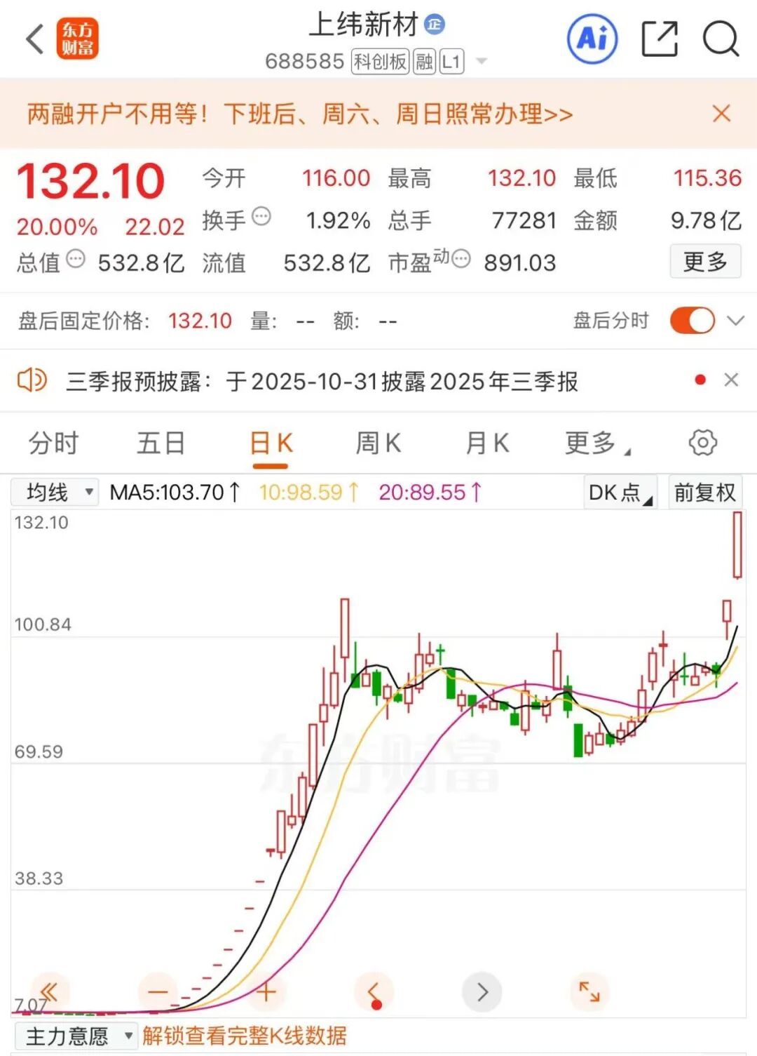 7月以来,上纬新材因智元概念股价飙升。截至今日收盘,上纬新材录得20%两连板,报132.1元/股。若以年内更大涨幅统计,上纬新材在成为今年首只“10倍股”后再创纪录,又成为了首只“20倍股”。