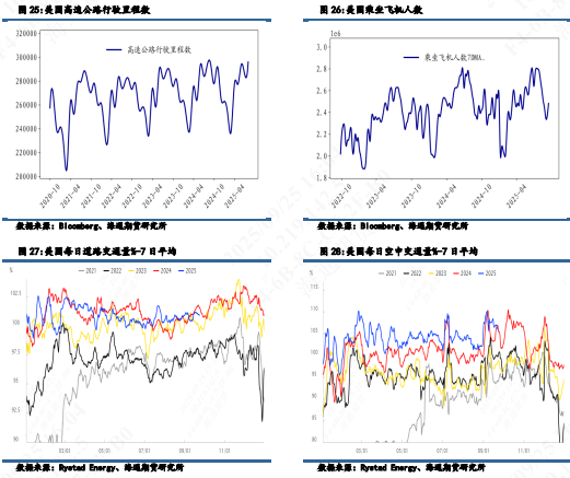从终端数据来看,道路交通量变化没有空中交通量大。从美国每日空中交通量数据来看,七日移动平均值在9月中旬降至2024年水平以下。总体而言,当前数值较2024年同期低3%。其中,国内旅行量下降3%,国际旅行量同比下滑6%。国际航线中美加航线受影响最为严重,较2024年水平降低5%,美欧航线则下降3%。这些趋势可能预示着美国作为旅行目的地的整体吸引力正在减弱。目前尚无明确证据表明出行需求从国际转向国内,因为国内旅行量同样呈现下降态势。