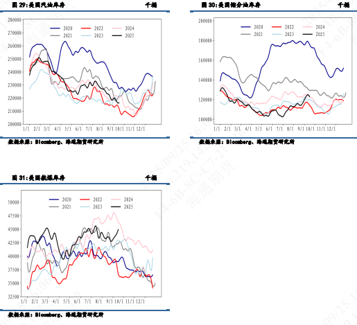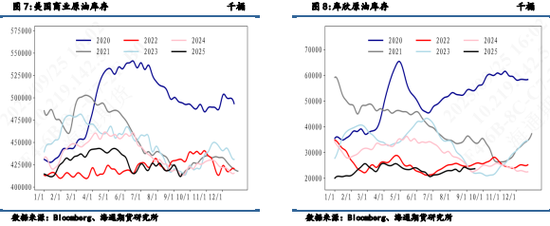 需求方面,美国原油表需有小幅下行,但仍高于历史同期平均水平。同时,炼厂角度的加工量环比也有明显下降,整体需求端支撑边际有所减弱。