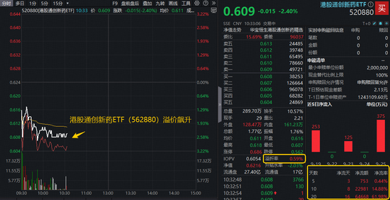 基于此,港股通创新药板块早盘大幅调整或更多是情绪面影响,“错杀”机遇凸显。部分资金嗅觉灵敏,逢跌涌入港股通创新药ETF(520880),持续推高溢价。