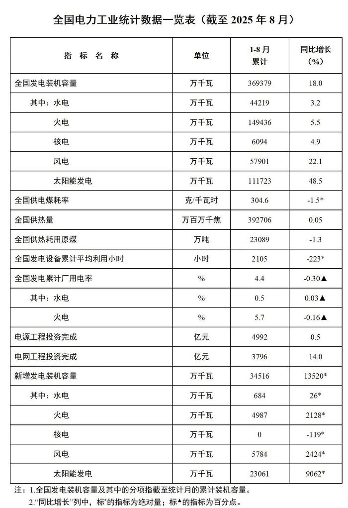 9月26日,国家能源局发布1-8月份全国电力工业统计数据。