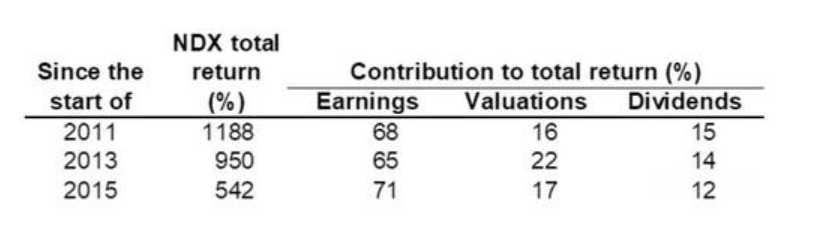 几周前,我提到了纳斯达克100指数自2009年初以来的表现(同时强调盈利和股息贡献了90%的涨幅)。作为回应,许多人问如果不是从历史低点算起,情况会如何——这是一个合理的问题。正如你所看到的,总体结论仍然相同——这并非一个过度市盈率扩张的故事。