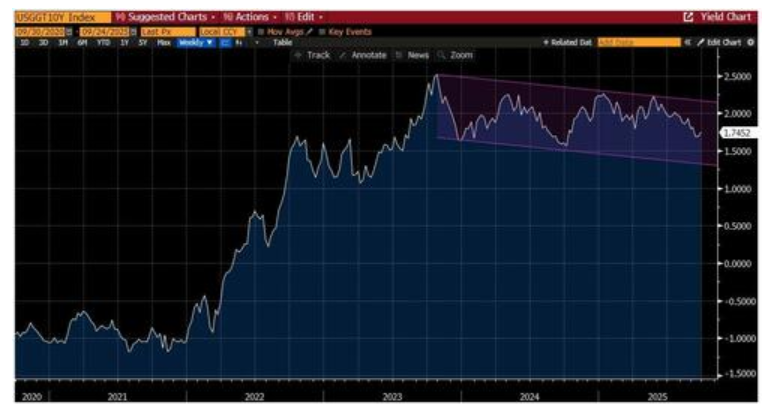 尽管过去几年风起云涌——以及伴随其中的叙事波动——但请注意美国实际利率一直处于区间波动状态。年初至今的实际利率压缩对股市是有利的。(此处为实际利率区间波动图表)