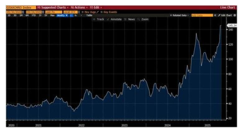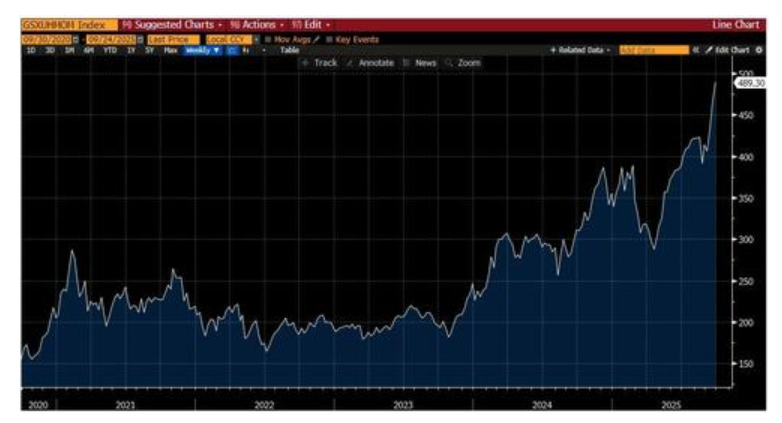 你之前见过这个——高盛的中国仿生机器人篮子。在这里我分享Rich Privorotsky的观点……美国和中国现在正进行一场技术“太空竞赛”。(此处为中国仿生机器人股票篮子图表)