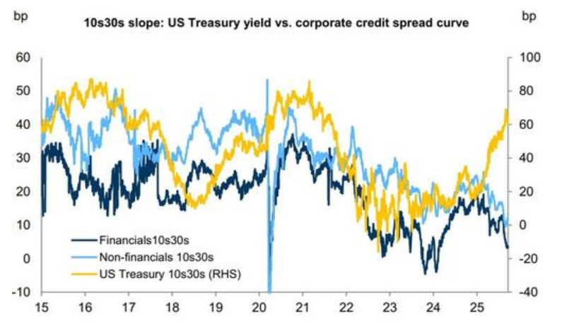可以清楚地看到,美国国债收益率曲线变陡的趋势非常明显——然而各类公司债券的信用利差走势却恰恰相反。
