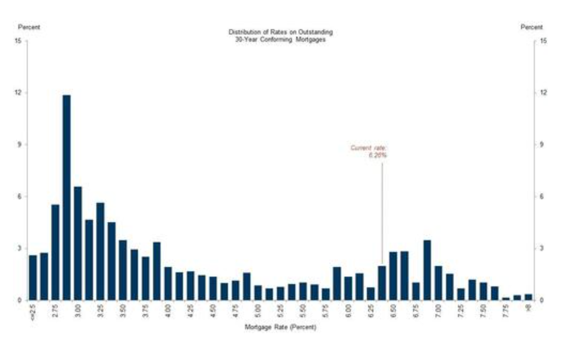 最后一张图表:未偿还的30年期抵押贷款利率的分布情况(credit = Jessica Rindels)。人们可以争论,近年来购房的房主在利率下降时应迅速进行再融资——但事实是,80%的抵押贷款借款人的利率低于当前水平。