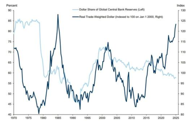 我认为这是一个有趣的叠加对比图。一方面,我假设各国央行的美元持有量将继续趋势性下降。但话说回来,这并不必然意味着对美元的表现将是压倒性的净负面。(此处为美元指数与央行美元储备趋势叠加图)
