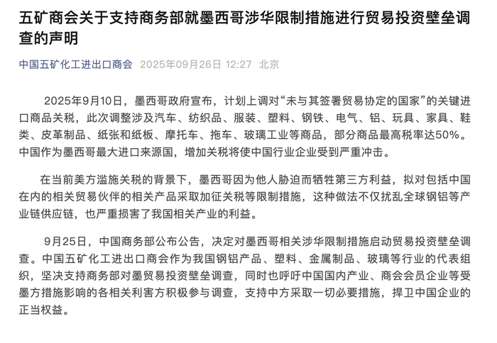 9月26日,中国五矿化工进出口商会发布声明称,作为我国钢铝产品、塑料、金属制品、玻璃等行业的代表组织,坚决支持商务部对墨贸易投资壁垒调查,同时也呼吁中国国内产业、商会会员企业等受墨方措施影响的各相关利害方积极参与调查,支持中方采取一切必要措施,捍卫中国企业的正当权益。