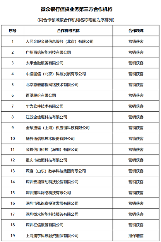 近日,民营银行赛道的“执牛耳者”——微众银行在其官网披露了信贷业务第三方合作机构名单,共计382家。
