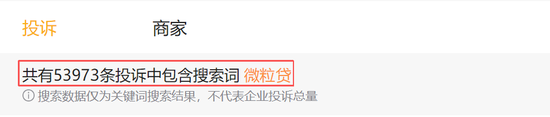 黑猫投诉 显示,搜索“微众银行”,出来的词条超过2.2万条;搜索“微粒贷”,出来的词条更是高达近5.4万条。
