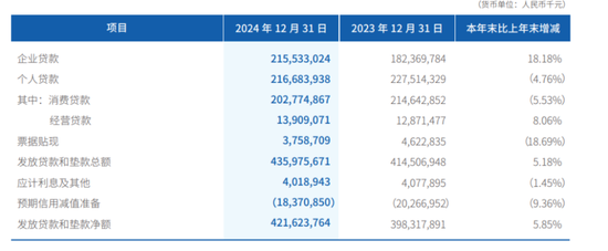 发放贷款和垫款总额为4359.76亿元,比上年末增加214.69亿元,增幅5.18%。其中,企业贷款2155.3亿元,增长18.18%,个人贷款2166.4亿元,同比减少4.76%,而在个人贷款中,消费贷贷款2027.74亿元,经营贷款139.09亿元。