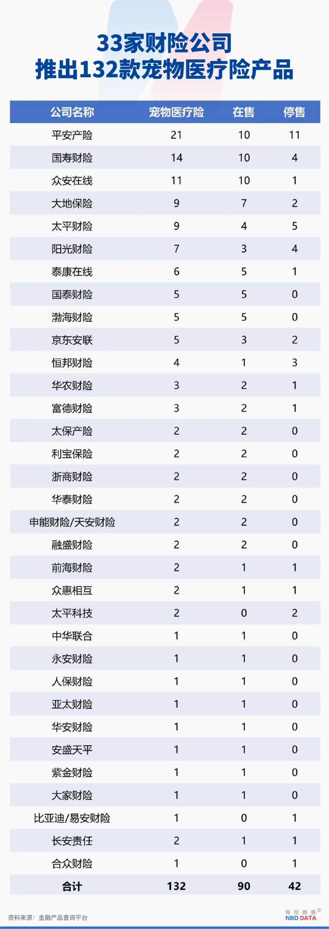 数据显示,有33家财险公司涉足宠物医疗险,占财产险公司总数近四成,共推出宠物医疗险产品132款,其中在售产品90款,停售产品42款。