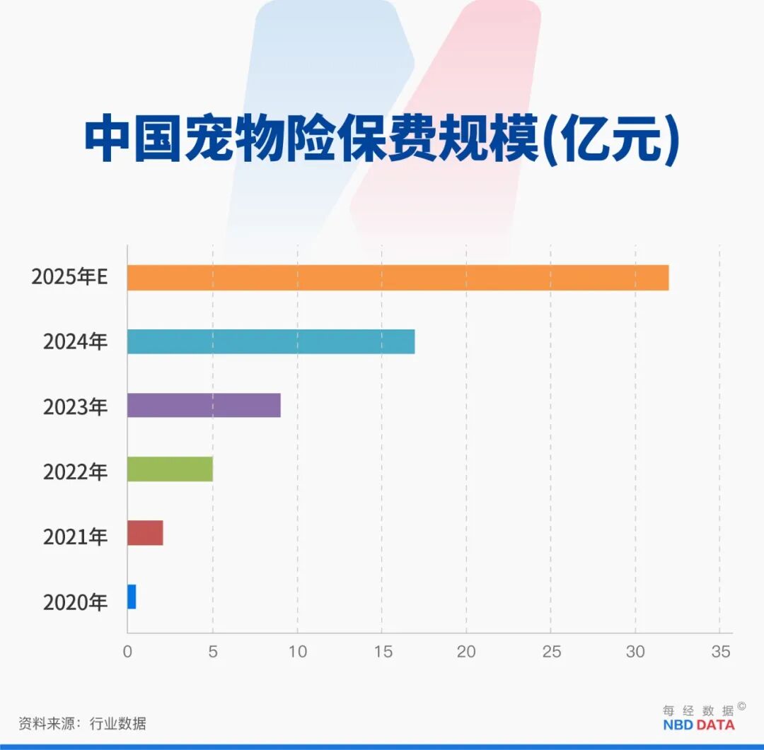 行业数据直观地展现了国内宠物险市场的增长潜力。2020年,中国宠物险保费规模约为5000万元,到了2021年便翻倍至亿元级别。随后的2022年至2024年,市场规模更是分别达到5亿元、9亿元、17亿元,几乎每年都实现近一倍的增长。按照过去5年的增速推算,2025年宠物险市场规模极有可能超过30亿元。