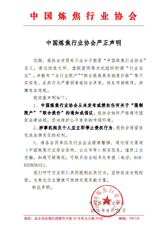 中焦协网:近期,我协会发现有不法分子假冒“中国炼焦行业协会”名义,通过伪造文件、虚假宣传等方式组织所谓“行业会议”,并散布“全行业限产”“联合提高销售价格”等不实信息。此类行为严重损害我协会声誉,扰乱市场秩序,涉嫌违法违规。现郑重声明如下:
