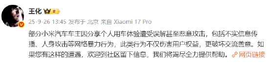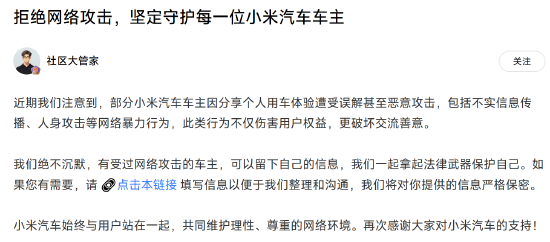 对此,小米公关负责人王化发文表示,“部分小米汽车车主因分享个人用车体验遭受误解甚至恶意攻击,包括不实信息传播、人身攻击等 *** 暴力行为,此类行为不仅伤害用户权益,更破坏交流善意。如果您有这样的遭遇,欢迎到社区留下信息,我们将竭尽全力提供帮助。”
