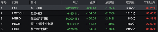 9月26日,港股三大指数齐跌。恒生指数收跌1.35%,报26128.20点;恒生科技指数跌2.89%,恒生国企指数跌1.49%。全日大市成交额为3237亿港元,南向资金净买入105.4亿港元。
