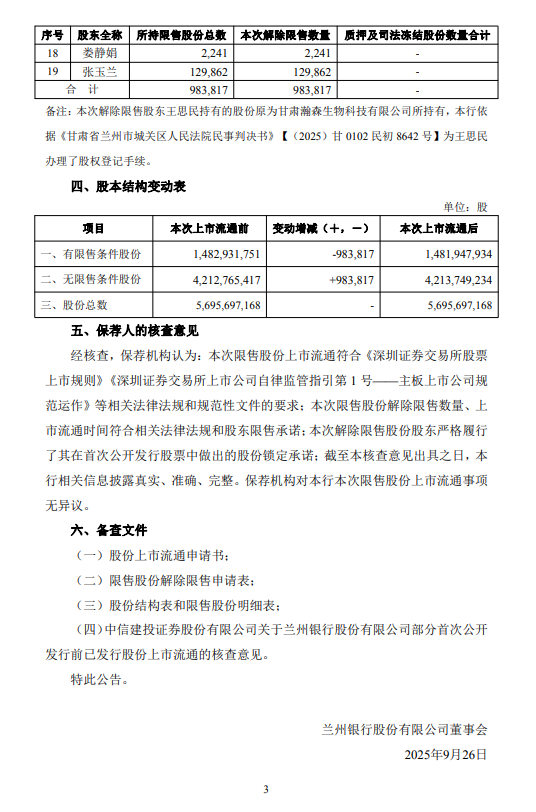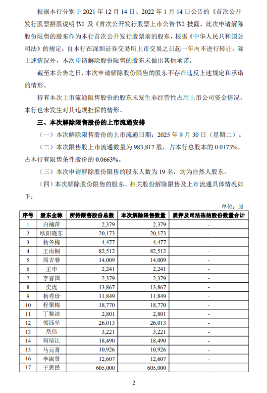 9月26日金融一线消息,公告,公司限售股份约98.38万股将于2025年9月30日解禁并上市流通,占公司总股本比例为0.0173%。本次申请解除股份限售的股东人数为 19 名,均为自然人股东。