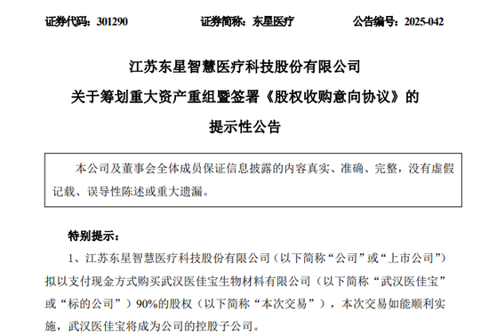 目前,此次交易尚处于初步筹划阶段。2025年9月26日,东星医疗已经与武汉医佳宝全体股东签订了《股权收购意向协议》,但最终收购股权比例、交易对方及交易价格尚需交易各方进一步协商后确定。