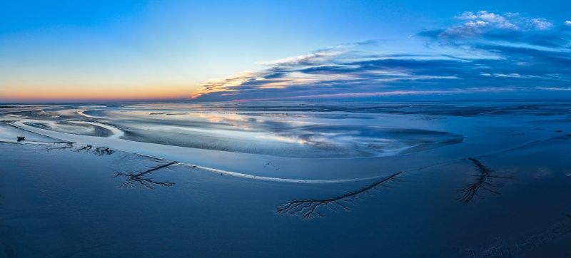 海潮涨落间,潮汐往复冲刷雕刻出无数水道,像数不清的参天巨树在滩面形成“潮汐森林”。蜿蜒的潮沟如巨树枝桠,成为海陆间物质、营养和能量交换的通道,滋养无数生命。
