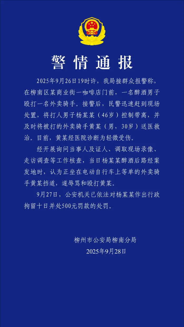柳州市公安局柳南分局9月28日发布警情通报:2025年9月26日19时许,我局接群众报警称,在柳南区某商业街一咖啡店门前,一名醉酒男子殴打一名外卖骑手。接警后,民警迅速赶到现场处置,将打人男子杨某某(46岁)控制带离,并及时将被打的外卖骑手黄某(男,30岁)送医救治。目前,黄某经医院诊断为轻微受伤。