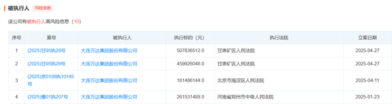天眼查数据显示,今年以来,大连万达集团股份有限公司新增多则被执行人信息。今年1月,大连万达集团股份有限公司新增执行标的2.62亿元,执行法院为河南省郑州市中级人民法院。今年4月,大连万达集团股份有限公司新增三则被执行人信息,合计执行标的为11.49亿元,执行法院分别为甘肃矿区人民法院、北京市海淀区人民法院。风险信息显示,该公司现存11条被执行人信息,被执行总金额超52亿元。