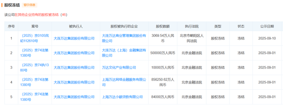此外,大连万达集团股份有限公司在其他企业持有的股权被冻结,相关股权冻结案件达40余则。9月1日,大连万达集团股份有限公司新增4则股权冻结信息,股权所在企业分别为大连万达(上海)金融集团有限公司、万达文化产业有限公司、上海万达 *** 金融服务有限公司、上海万达 *** 有限公司,冻结股权数额合计超145亿元,执行法院均为北京金融法院。
