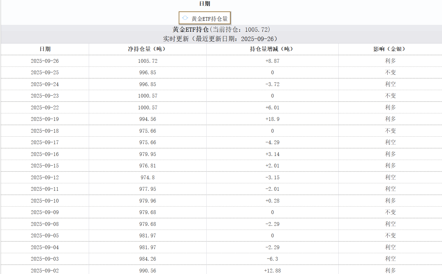 黄金的涨幅已经让全球资金沸腾,SPDR 9月都在大幅增仓,其中9月19日加仓18.9吨,9月22日加仓6.01吨,9月26日增仓8.87吨,这让SPDR的持仓突破1000吨,直接达到1005.72吨。