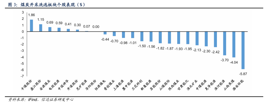 ⚫ 本周煤炭采选板块中涨跌幅前三的分别为(1.86%)、盘江股份(1.15%)、安源煤业(0.69%)。