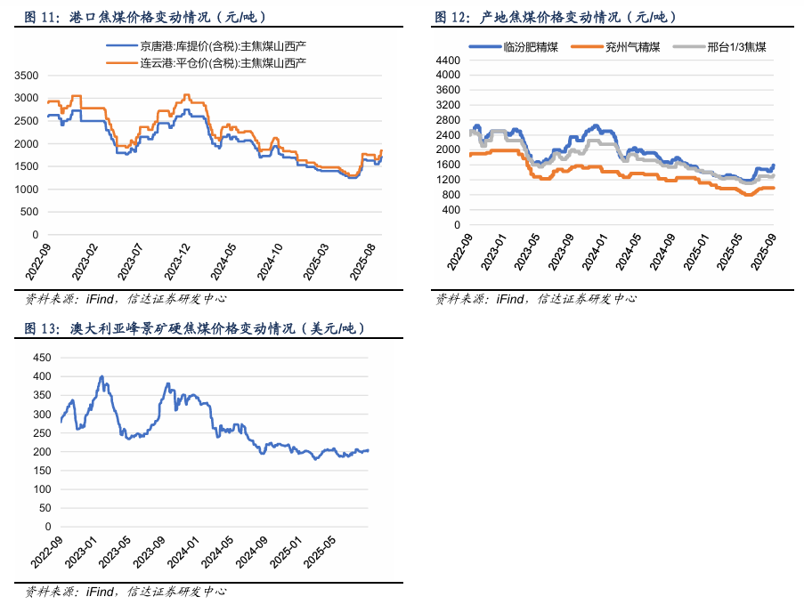 炼焦煤价格方面:本周京唐港价格周环比增加,产地临汾价格周环比增加。港口炼焦煤:截至9月26日,京唐港山西产主焦煤库提价(含税)1710元/吨,周上涨100元/吨;山西产主焦煤平仓价(含税)1847元/吨,周上涨118元/吨。产地炼焦煤:截至9月26日,临汾肥精煤车板价(含税)1590.0元/吨,周环比上涨80.0元/吨;兖州气精煤车板价985.0元/吨,周环比持平;邢台1/3焦精煤车板价1320.0元/吨,周环比上涨40.0元/吨。国际炼焦煤:截至9月26日,澳大利亚峰景煤矿硬焦煤中国到岸价204.9美元/吨,周环比上涨1.5美元/吨。