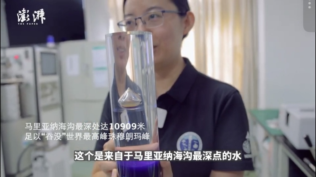 这滴水来自全世界最深的海底,马里亚纳海沟约11000米深处,那里水压高达1100个大气压,相当于20头大象站在一个指甲盖上。
