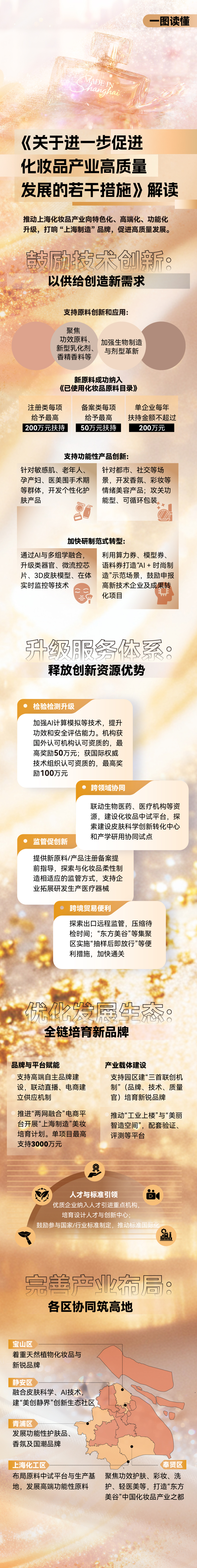 上海市经信委表示,《若干措施》还强调着力发展功能性化妆品,提出个性化护肤,满足不同人群的不同需要,比如医美围手术期、老年人、孕产妇等,以更优的供给创造新的消费需求。空间载体方面,《若干措施》明确推动“工业上楼”,加快“美丽智造空间”载体建设和项目导入。
