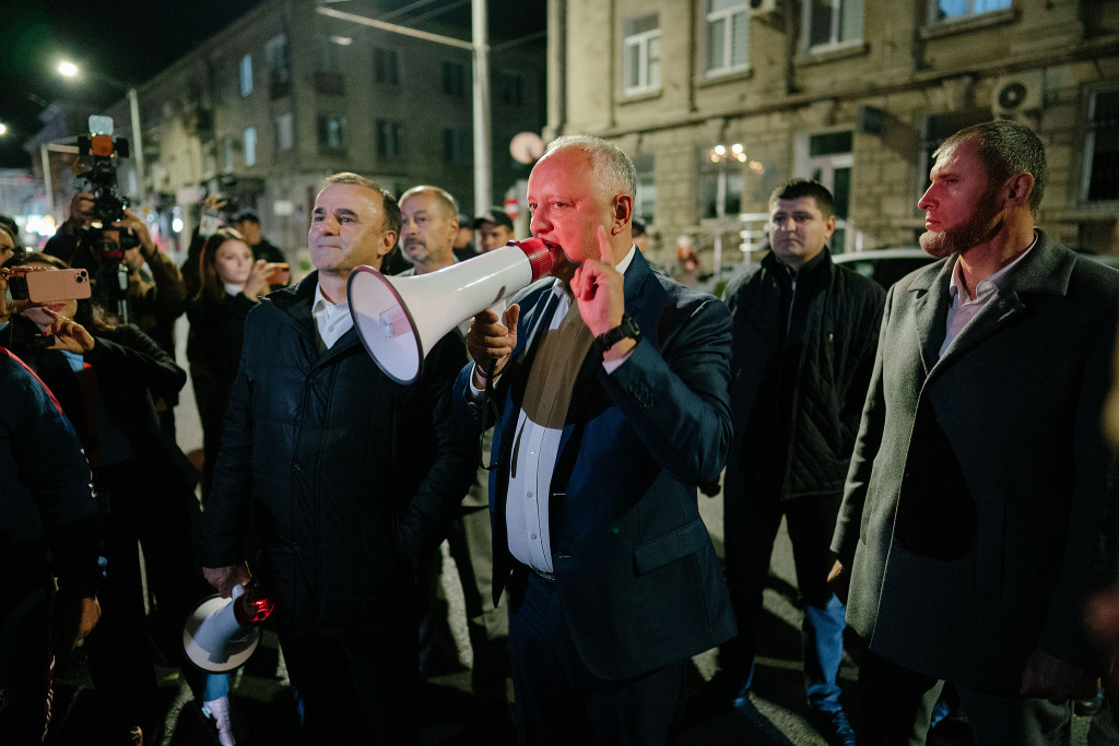 当地时间2025年9月28日,摩尔多瓦基希讷乌,摩尔多瓦前总统、反对派“爱国联盟”领导人伊戈尔·多东在投票结束后,于中央选举委员会前向支持者发表讲话。视觉中国 图