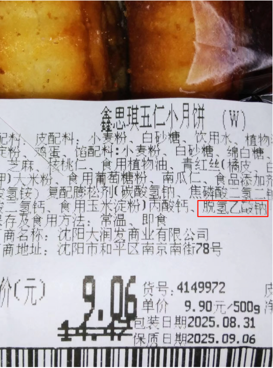 有报道称,消费者李先生在大润发(沈阳和平店)发现,购买的鑫思琪五仁小月饼配料表中标注含有“脱氢乙酸钠”,而该添加剂已被禁止在一些食品中使用。